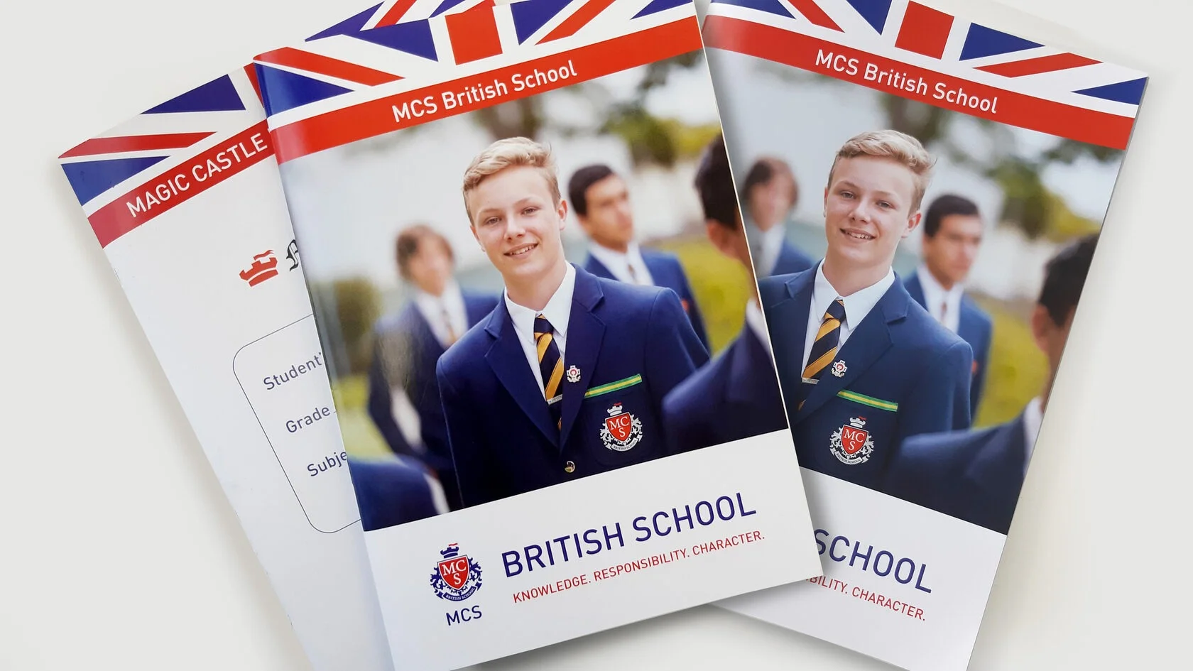 The main unifying element for the entire corporate style of the school was the logo, executed in a heraldic style and using the colors of the British flag.