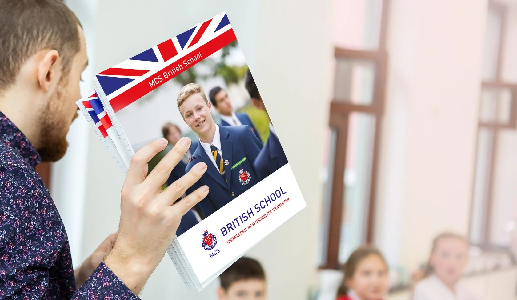 The main unique offering of the school to its clients is British education in Moscow; therefore, the colors of the British flag and the flag itself were used on all the carriers.