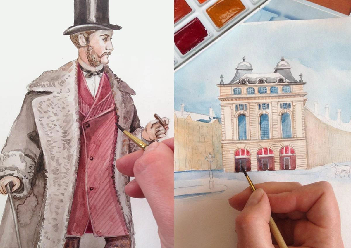 We ended up with a truly handmade work: all the details of the drawing, including the ornament, were hand-drawn by us in watercolor.