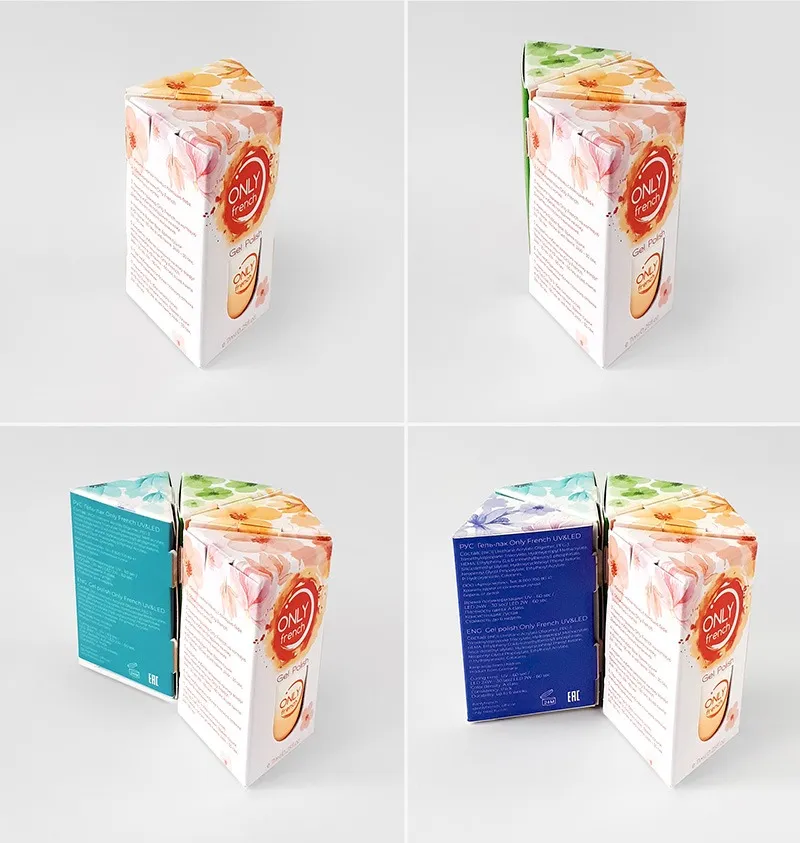 On three sides of the boxes (two triangular lids and the front), we have incorporated an abstract design that unifies all the packaging into a single art object. This was done to create a desire in the buyer to purchase the entire set of colors at once. Each package has its own shade corresponding to the polish inside, smoothly transitioning from one box to another.